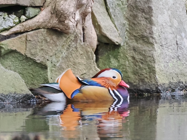 お池にはカラフルな羽毛を身にまとった「世界一美しい水鳥」といわれる「オシドリ(オス)」がのんびりと浮かんでいました。